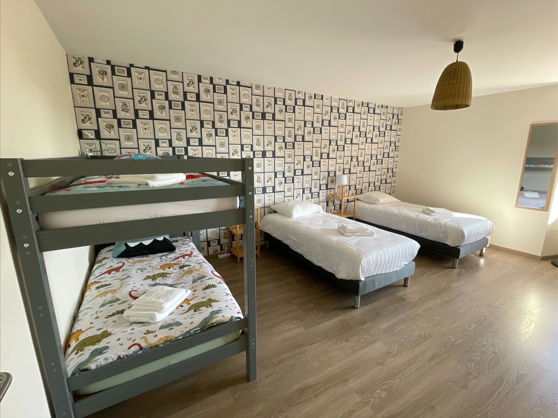 Pour les plus jeunes, deux lits superposés 90x190 cm avec matelas mousse enfants et oreillers hypoallergéniques offrent un coin nuit ludique et douillet, propice aux chuchotements et aux rêves partagés.